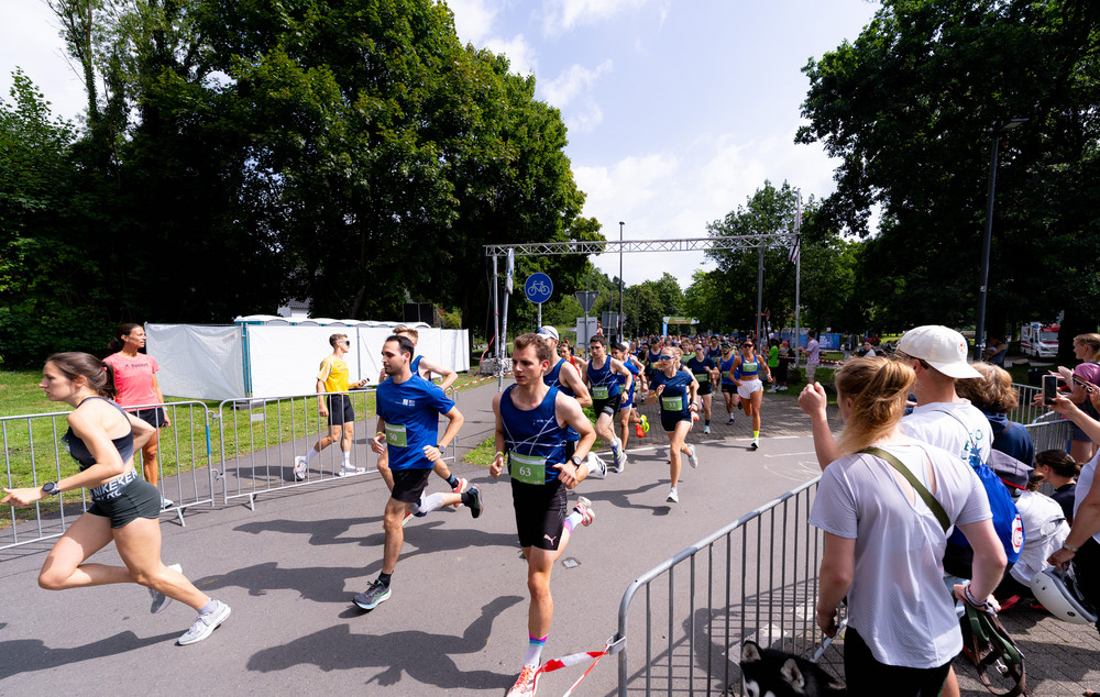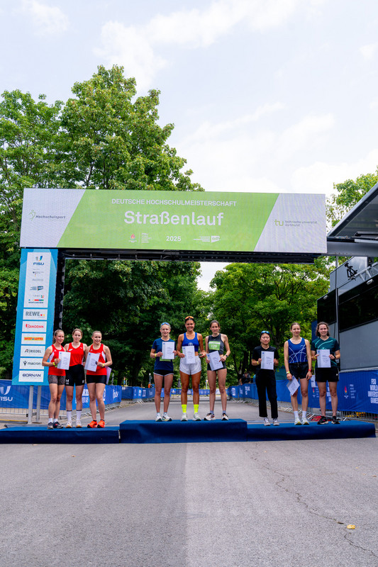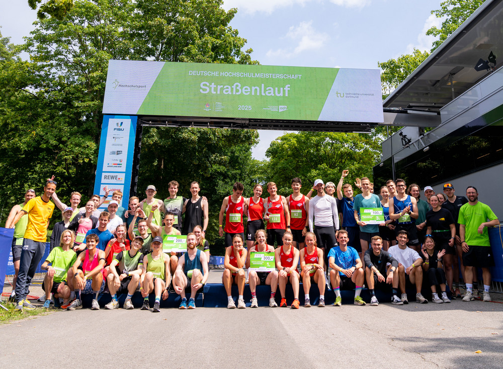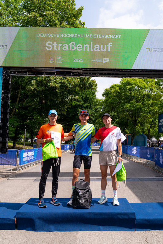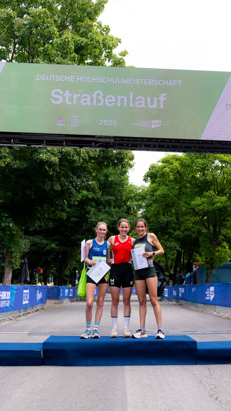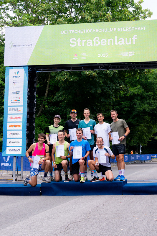Im Rahmen der Deutschen Hochschulmeisterschaften im Straßenlauf gibt es neben der Einzel- auch eine Teamwertung. Dabei werden die Zeiten der jeweils drei schnellsten Läufer*innen addiert. Voraussetzung ist, dass die Läufer*innen an der gleichen Hochschule studieren bzw. arbeiten. Bei den Herren gewannen Linus Erdmann, Jonas Schmitz und Marc Leineke von der RWTH Aachen mit einer Gesamtzeit von 01:41:28. Der Vorsprung auf Platz 2 betrug nur neun Sekunden. Auf diesen lief das Team der TU Dortmund mit Lorenz Rix, Elias Kroll und Fabian Dillenhöfer. Platz 3 sicherte sich das Team mit der längsten Anreise. Frederik Schäfer, Lucas Worth und Markus Krause nahmen Urkunde und Siegernadel mit auf den langen Heimweg nach Freiburg. Bei den Damen machten drei Teams aus NRW den Titel unter sich aus. Nicht zu schlagen waren die Läufer*innen aus Bochum. Marie Winse, Verena Vorspohl und Carla Werner von der Ruhr-Uni sicherten sich den Deutschen Meistertitel im Team. Platz 2 ging an die Uni Köln, für die neben Anna Gehring Nicole Warmer und Michelle Gerards liefen. Die RWTH Aachen konnte sich über eine weitere Podestplatzierung freuen. Peiqi Tan, Jula Krückel und Laura Koch liefen auf Platz 3.